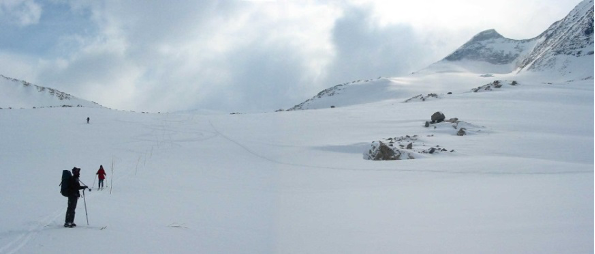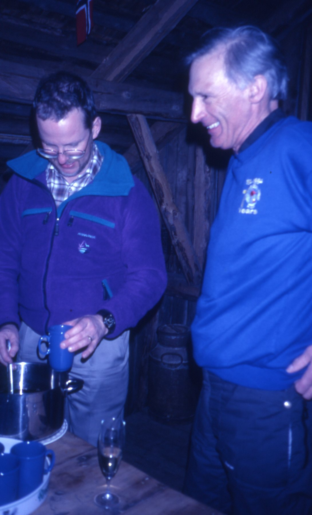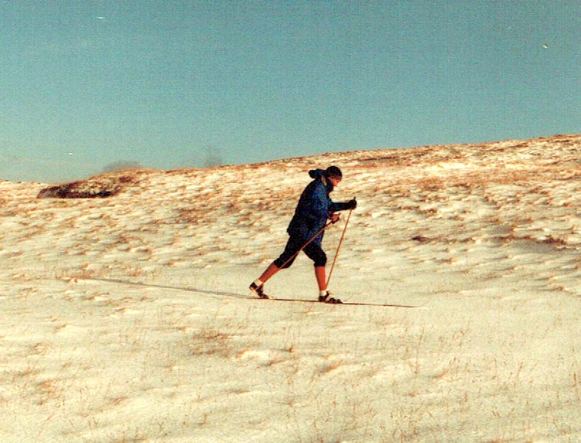 The coaching that the club provided on both rollerskis and dry slope skiing also evolved greatly in the following decades, stimulating many different types of activity on Nordic skis. Firstly, the club had a strong contingent of members who enjoyed hut to hut touring with large packs, mainly in Norway, skiing sticked routes through national parks such as Dovrefjell, the Hardangervidda, the Jotunheim and the Rondane, and staying in the vast network of serviced and unserviced huts run by the Norwegian DNT. Particularly keen tourers of this era were Brian Barr‑Taylor, Ros Brown‑Grant, Matthew Carter, Nick and Jayne Davies, Kathy England, Geoff Hollins, Nigel James and Gill Rimington.