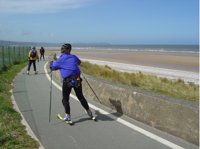 Finally, rollerskiing has become something of an activity in its own right as well as being a form of training for track skiing, loppet racing or hut‑to‑hut touring, particularly since the club moved about ten years ago to the cycle track at UCLan in Preston. This change in venue has not only meant that the club finally has regular use of a proper dedicated track but its location has allowed it to join forces with coaches from other northern clubs who are also Manchester members, such as Mike Smith (Lakeland). Although the club used to lead rollerski tours along cycle tracks in places like Chester (River Dee), the Lakes (Camerton to Whitehaven), Lancaster (Crook of Lune to Heysham), the Peak District (Manifold Trail, Upper Derwent Valley) and North Wales (Prestatyn to Colwyn Bay), these have been superseded in recent years by open track sessions at UCLan and Tameside cycle track. These sessions offer a more reliable and manageable way for skiers of all abilities to clock up the miles on rollers and are proving particularly popular with those members who have been coming on the club’s recent track skiing trips to Dobbiaco, with lessons provided by its own coaches such as Rosie Blades, Ros Brown‑Grant and Alison Pawley.