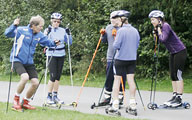 Ideally by the end of the programme, all beginners would be of a level able to take part in the open track sessions at UCLan that are run over the late spring and summer (see Events page for details) or for a cross‑country holiday on snow. Those with some previous experience should be ready for anything: loppet racing, touring on snow, or the Northern Roll challenge which involves four one‑hour events organised once a month in May‑August at venues in the North West and North East of England. Open track sessions for roller skiers with their own equipment are also held for several weeks in late autumn/winter at the Tameside Cycle Track in Ashton‑under‑Lyne (see Events page for details) to help skiers prepare for forthcoming winter holidays on snow. SnowSport England Courses